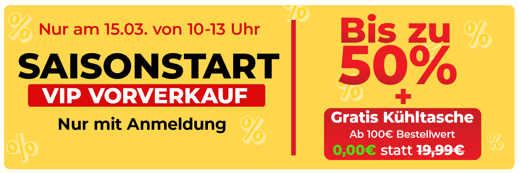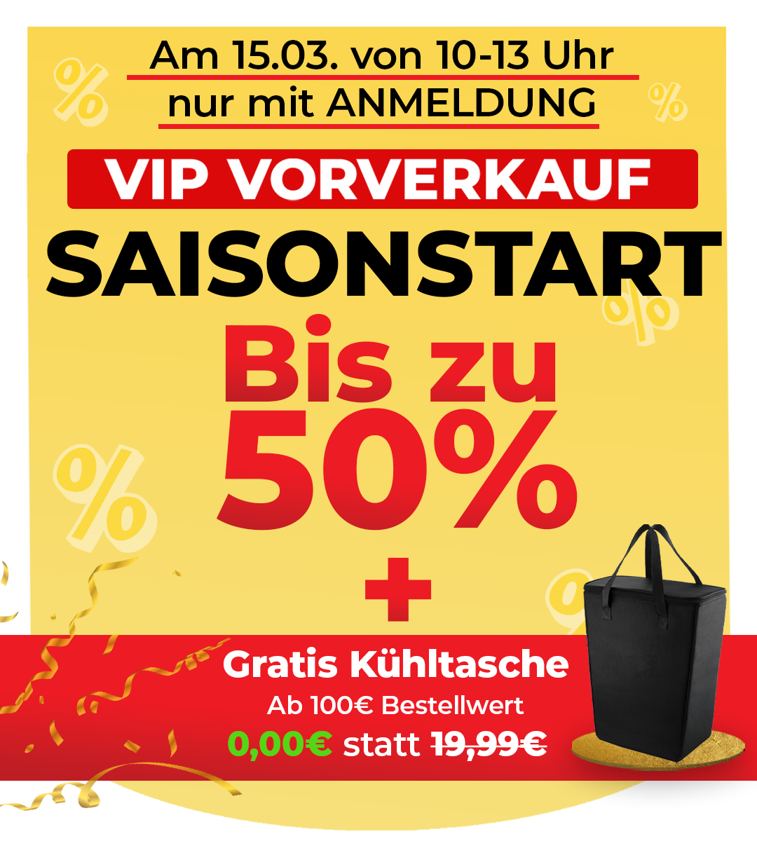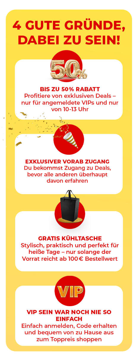 Nur am 15.03. von 10–13 Uhr erhältst Du exklusiven Frühzugang zu unseren besten Angeboten – bis zu 50% Rabatt 🎉 und eine Gratis Kühltasche ab 100€ Bestellwert 🎁.